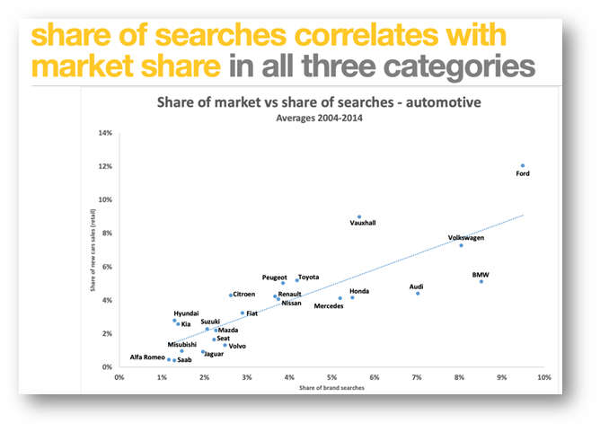Les and team have reviewed historic data of search and purchase behaviour in three different markets (automotive, energy and phones). This automotive example shows that, as you might expect, there is a correlation between share of searches and market share. Simply put, more people will search for brands which have better awareness and sales. This chart shows the correlation for car brands in the UK. It has dated data to protect client confidentiality.