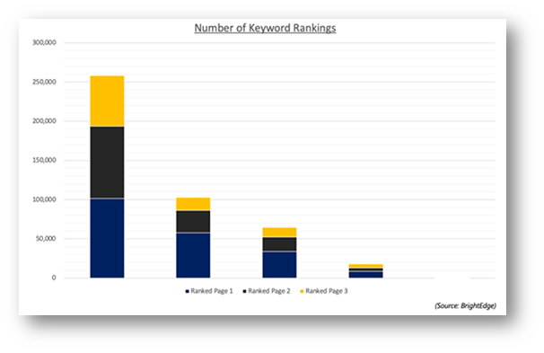This analysis from BrightEdge shows the number of a defined set of keywords for four brands from the fashion industry (names removed to protect confidentiality) rank for within Google.