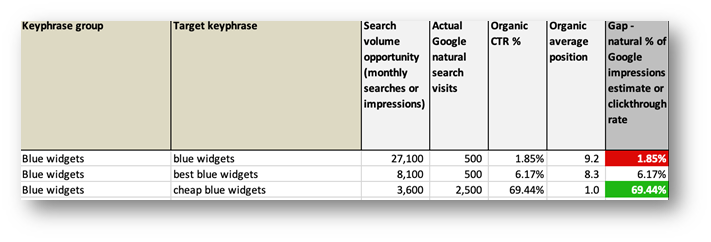 Search gap analysis is a technique I have advocated for, for 10+ years, and ClickThrough have long used as part of our in-depth SEO analysis. It’s powerful since it’s based on comparing potential and actual number of visits to identify opportunity to drive more site visits. The technique integrates consumer search intent from Google or other sources showing potential search volume, and then compares it to actual search volume, from Google Search Console, to identify areas where there is good visibility based on visits shown in green against opportunities.