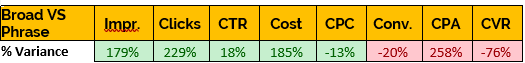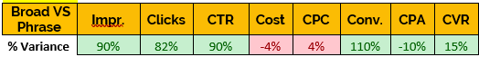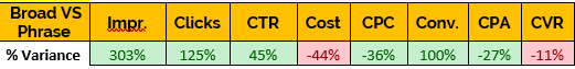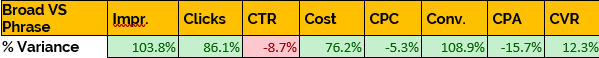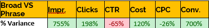 As you can see Broad was able to generate a 700% increase conversions despite only a 120% difference in spend. It managed to achieve this with a significantly lower Clickthrough Rate which was 65% lower than Phrase.