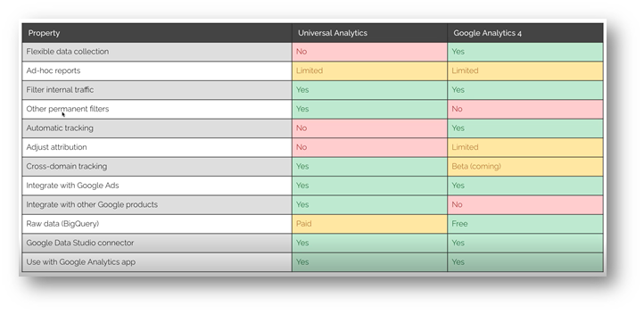 In terms of attribution, we all know that last click is the model for UA, but there is some limited scope for changing the attribution model that underlies that way you look at your GA4 data. Cross-domain tracking is on its way, and there is also a free, big query export system.
