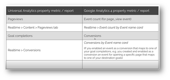 For those of us who are used to looking at pageviews, we have to start thinking about event count. There is a page_view event that represents what we would have thought of in UA as a pageview. In terms of realtime, we start to see event counts by event names. Goal completions are now known as conversions, and realtime conversions are now conversions by event name card. That’s quite a big change and important for anyone concerned about conversion rate optimisation. Finally, bounce rate has now disappeared, and has been replaced by engagement.