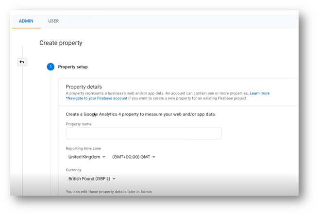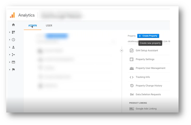 For a brand new setup, if you were to go into your admin area in Google Analytics, you would see “create a property”.