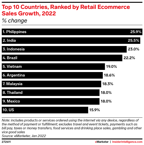 However, here is where eCommerce sales will grow the fastest in 2022. This year, the Philippines and India will lead the world in retail eCommerce sales growth, with increases of 25.9% and 25.5%, respectively. Latin American and Southeast Asian countries will make up the majority of the top ten list, with the United States taking the final spot as the only advanced economy to slip into the rankings, with 15.9% growth.