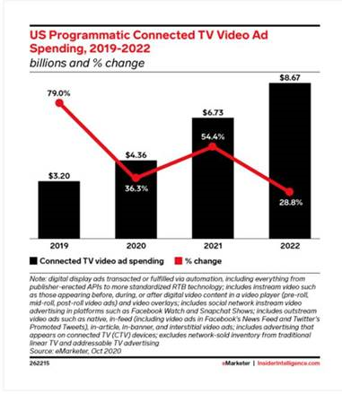 US advertisers spent an estimated $11.6 billion more on programmatic CTV ads in 2020 than in 2019. eMarketer forecast that this could grow to $2.31 billion in 2021.