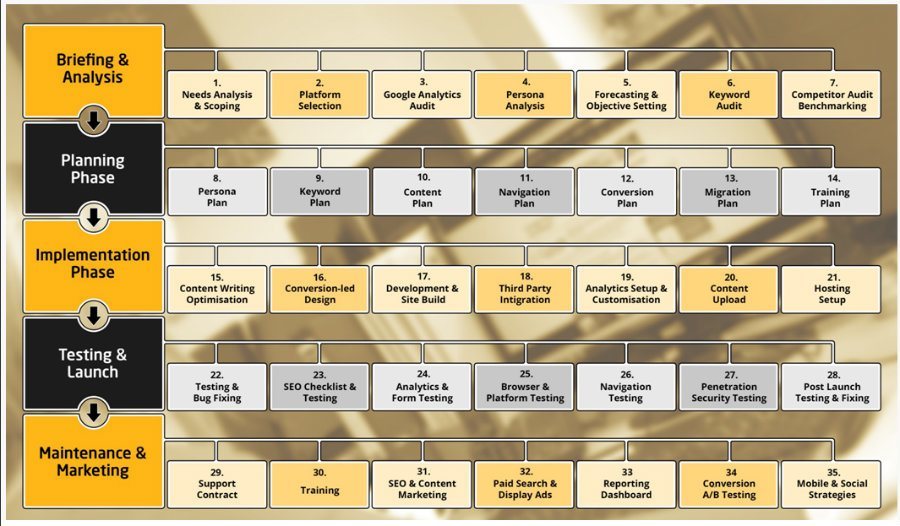 The 35-step process is built on years of marketing and web development and experience, and is designed to ensure every aspect of a website supports its marketing goals – from planning to design to delivery.