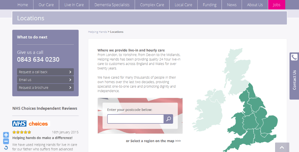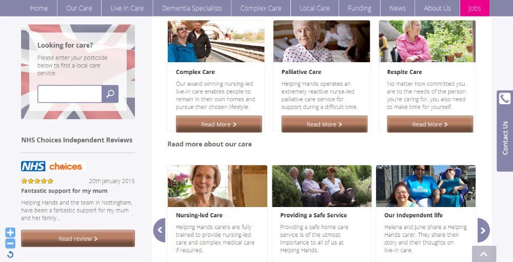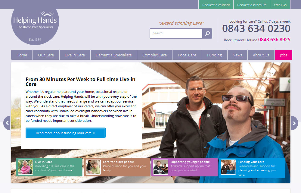 As for Helping Hands’ content management system, ClickThrough identified at an early stage that a simple, easy-to-use platform like WordPress would suit the care company’s needs. Helping Hands’ team were frustrated that their current CMS prevented them from editing content themselves, and they had no need for a complex e-Commerce system that would require extensive training and investment.
